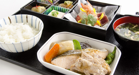 ビジネスクラスでは、空の上のレストラン「スカイオーベルジュ BEDD(ベッド)」のスターシェフ、山田チカラシェフが、ホノルル線だけのために考案したスペシャルメニュー“BEDD for Resort"を提供。和食は、旬の秋鮭と豚肉の生姜焼きの両方が一度に楽しめるメニューを、洋食は「山田チカラ」特製のマディラ酒にトリュフを加えたソースペリグーを合わせた国産牛ヒレ肉のステーキを楽しめる。