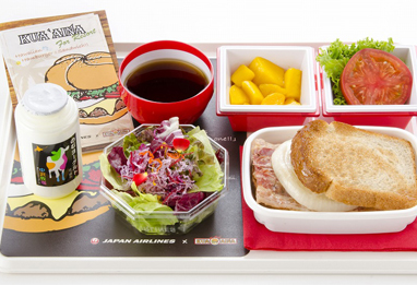 エコノミークラスの羽田発便では、ハワイでも日本でも愛されるハンバーガーショップ 「クア・アイナ」とのコラボレーションメニュー“クア・アイナ for Resort"を到着前の朝食として提供。人気のBLT サンドウィッチをオリジナルメニューにアレンジし、バンズにはメゾンカイザーのパンを用意する。