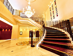 この坂の下にあるホテルが、ANAクラウンプラザホテル長崎グラバーヒルだ。インターコンチネンタルホテル系で、中層のレンガ色の建が南山手のランドスケープになじんでいる。客室数は216室、ロビーも落ち着いた雰囲気だ。
