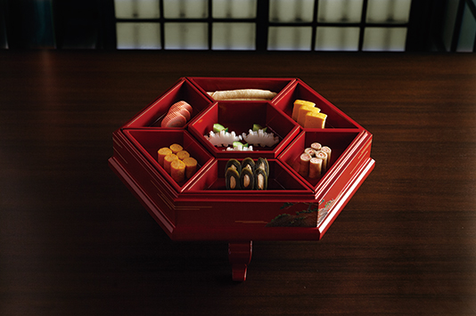 (上)美しい堆錦(ついきん)が施された漆塗りの器「東道盆(とぅんだーぶん)」に盛られた料理。中央は飾り切りした花イカ、上が「ぽうぽう」、左は肉(しし)かまぼこ。見た目にも美しい華やかな料理だ。●琉球料理 「美榮」 TEL098-867-1356(要予約)(左下)琉球王国の中心地となった首里城。中央は儀式が行われた御庭、左の北殿は中国からの冊封使を舞踊や宮廷料理でもてなした場所。(右下)上は行事料理に欠かせない「らふてぇ」、下右が「なかみのお吸いもの」、左が「みぬだる」、島大根の黒糖漬、田いもの空揚げ。泡盛にも合う。