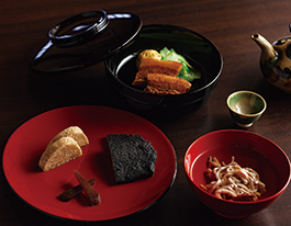 那覇市の「美榮(みえ)」では、伝統の琉球料理を味わうことができる。創業者は首里の生まれで、首里士族の伝承料理を食べて育った古波藏登美(こはぐらとみ)さん。赤瓦を白漆喰で塗り込んだ屋根に、沖縄独自の低く構えた木造建築。この伝統的な空間で、登美さんが蒐集した琉球漆器や壺屋焼、民具などの工芸品に触れながら、琉球王国時代の香りがする特別な琉球料理を堪能できるのも魅力だ。料理は、肉味噌を小麦粉の皮で巻いた「ぽうぽう」。豚の胃と腸を使った「なかみの吸いもの」は、内臓の臭みを消すために何度も水洗いをし、短冊に刻み、さらに鰹節と肉出汁をしみこませる。手間と暇を惜しまず、丁寧に仕込みをするのが琉球料理の神髄だ。「琉球では諸外国の影響で個性的な食文化が生まれました。その琉球文化を途絶えさせてはいけないという創業者の思いを、料理や空間から感じてもらえたら」と女将の古波藏德子(こはぐらのりこ)さん。