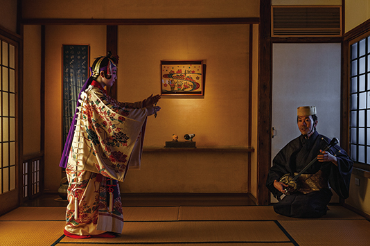 今に伝わる琉球王国時代の宮廷文化の一つに琉球伝統芸能が挙げられる。「琉球古典音楽や琉球古典舞踊などの宮廷芸能は、『国学』として外交のツールとされていました。首里城だけでなく、江戸や薩摩の屋敷に“踊奉行"を派遣して披露していた」と話す歌うた三さん線しんの師範で、沖縄県立芸術大学の山内昌也(やまうちまさや) さん。山内さんが代表を務める琉球伝統芸能デザイン研究室では、琉球王国時代に演じられていた本来の宮廷芸能を再現し、限られた人のために上質な空間で演じ始めた。この試みが「美榮」での上演により最高の空間が誕生したわけだ。歌三線と舞踊のみ。ゆったりとした雅な旋律に、首里城で使われていた、現在の沖縄の方言とも異なる古語の歌が真言のように響き、それに合わせて伝統装束の紅びん型がたを着た踊り手が舞う。座敷では、畳の上で舞うすり足や三線の弦を押さえる音まで聞こえる。この細やかさ、神経の行き届いた優美さにこそ、宮廷芸能の美学が宿る。