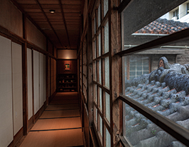 (左)1960年に建てられた「美榮」の座敷へと続く畳廊下。コンクリートが主流になりつつあった時代に、あえて昔ながらの伝統的な木造建築にこだわった。