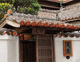 (右)沖縄らしい赤瓦の「美榮」外観。建築、器、料理、調度品に至るまで、琉球文化を肌で感じられる店である。※現在、琉球伝統芸能鑑賞を含むプランは準備中。