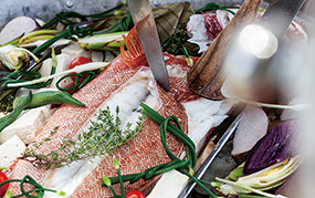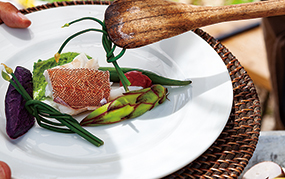 「子供の頃、半農半漁だった祖父と一緒に船に乗り、『この風が吹く時はあそこに魚がいる』なんて話を聞きながら、海に潜ってハリセンボンやサザエをとったり、それを祖母が味噌汁にしたり。県外へ出て沖縄を俯瞰して見ると、そういう遊びこそが楽しかったし、沖縄ならではのものだと痛感したのです。だからこのプランでは、サバニで海へ出て遊んだり、地元の魚はもちろん、仲間の島野菜やハーブなど、やんばるにある食材を使った野外料理で自然をまるごと楽しんでもらっています。料理や遊びの内容は、ほぼオーダーメイド。海以外、川遊びとトレッキング、畑の収穫体験を組み合わせたり、ホットサンドセットを持って森にピクニックに出かけたり」