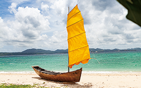 (左上)やんばる産のレモンやグァバ、シークワーサー、レモングラスなどのハーブで香りづけしたフレーバーウォーター。(中上)アカジン、紅芋、島豆腐のほか、花ニラやジンジャーリリー、ドラゴンフルーツのつぼみやオクラも加え、からしな(シマナー)のソースで食す。(右上)アカジンを料理。鍋の下にはサンゴを敷き、海水を少し入れ、白ワインで魚や島野菜を蒸す。サンゴで蒸すと磯の香りが立つ。(左下)伝統的な木造の舟、帆かけサバニ。風と潮を読んで進める。石垣の船大工からサバニ造船の技術を継承した若手がやんばるで活躍中。(中下)海辺に咲くハマゴウ。茎は地面をはい、半ば砂に埋もれて伸びる。果実は蔓荊子(マンケイシ)と呼ばれる生薬で鎮痛、鎮静、消炎作用がある。(右下)仲間の畑でとれた島バナナやレモン、青パパイヤ、マンゴー、ゴーヤなどなど。季節の野菜を収穫体験できるプランもある。
