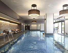 (左)「インドアプール」完成予想CG。季節や天候を問わず一年を通して利用できる屋内プールには、子ども用のプールも併設。