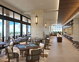 (右)「レストラン」完成予想CG。窓の外には青い空と海が広がる開放感あふれる空間で満たされたひと時を。