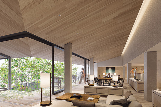 若宮大路に面した前庭と中庭は、桜やイチョウなどの植栽が彩りを添える。路地をイメージしたエントランス、その奥に続く廊下には鎌倉らしさを感じるアートワークが。2階のロビーはナチュラルな雰囲気のインテリアに包まれ、窓の向こうには縁側のようなテラスがある。窓を開放すれば、自然の風を取り入れることができる。
