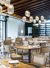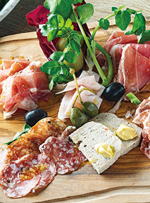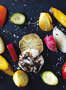 (左から)色鮮やかな野菜をジョスパーチャコールオーブンで焼いた一皿。ハモンセラーノやパル柔らかく香りのいいLボーングリル。フレーク状の岩塩でいただく。 マ産生ハムを盛り合わせたハムプラッター。柔らかく香りのいいLボーングリル。フレーク状の岩塩でいただく。アネックス棟の3階にオープンしたタパス&チャコールグリル「ラ・シマ」。窓が広く解放的な空間で、奥に見えるバーからは美しい夕日を眺めることができる。